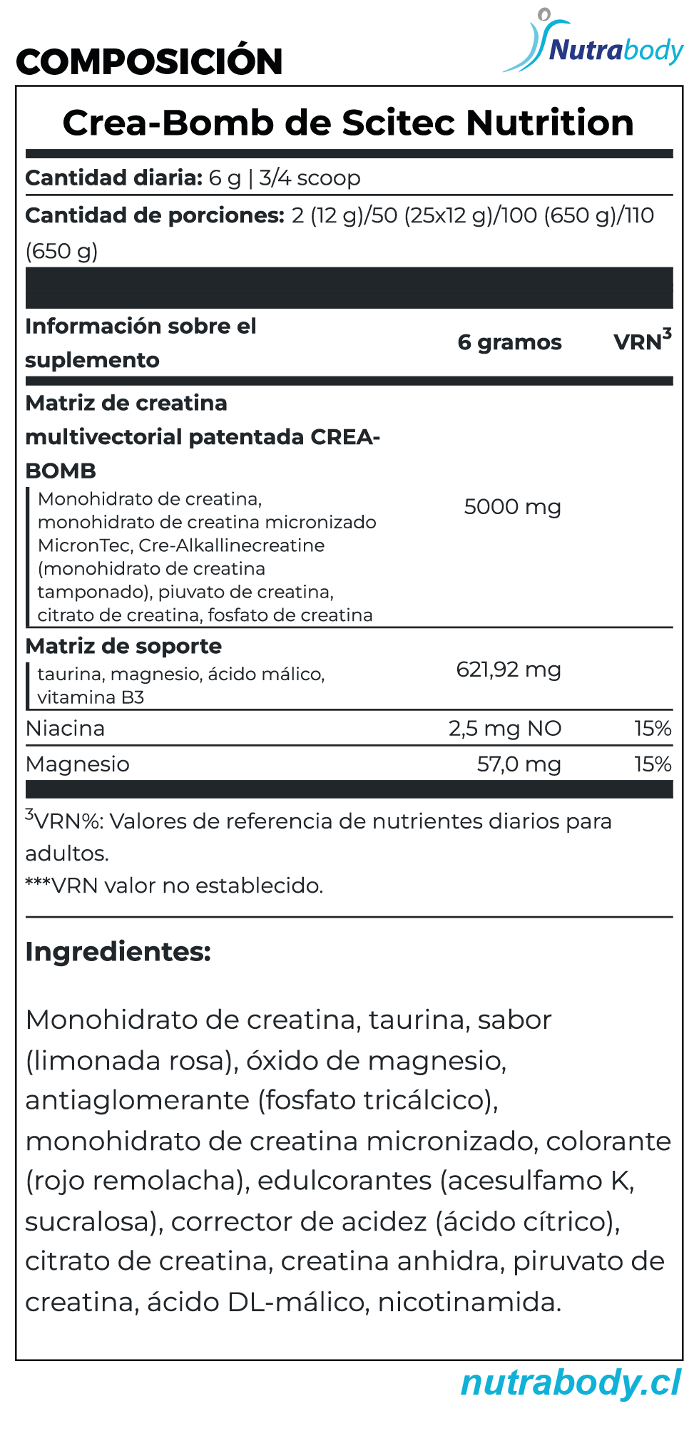Además de creatina, su fórmula incorpora taurina, óxido de magnesio, ácido málico y niacina (vitamina B3), nutrientes comúnmente utilizados en nutrición deportiva para complementar planes de entrenamiento exigentes. Esta combinación convierte a Crea Bomb en una alternativa completa frente a las creatinas simples, integrándose fácilmente en rutinas orientadas a la fuerza y el desempeño físico.