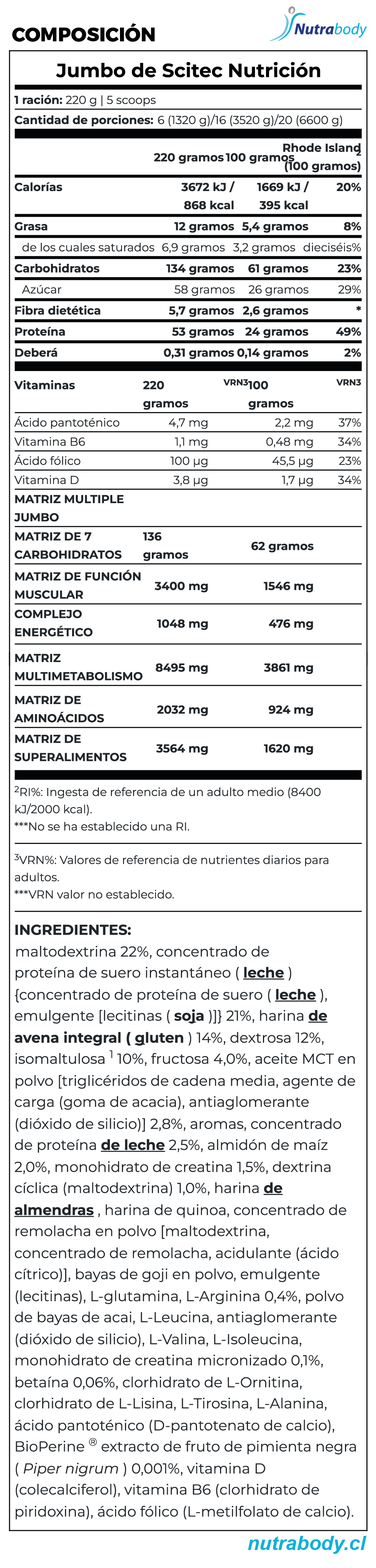 Jumbo Weight Gainer Scitec Nutrition 3.520 g es una opción completa para quienes buscan incrementar su aporte calórico diario, optimizar su nutrición deportiva y apoyar objetivos de volumen y masa muscular dentro de un plan de entrenamiento estructurado.