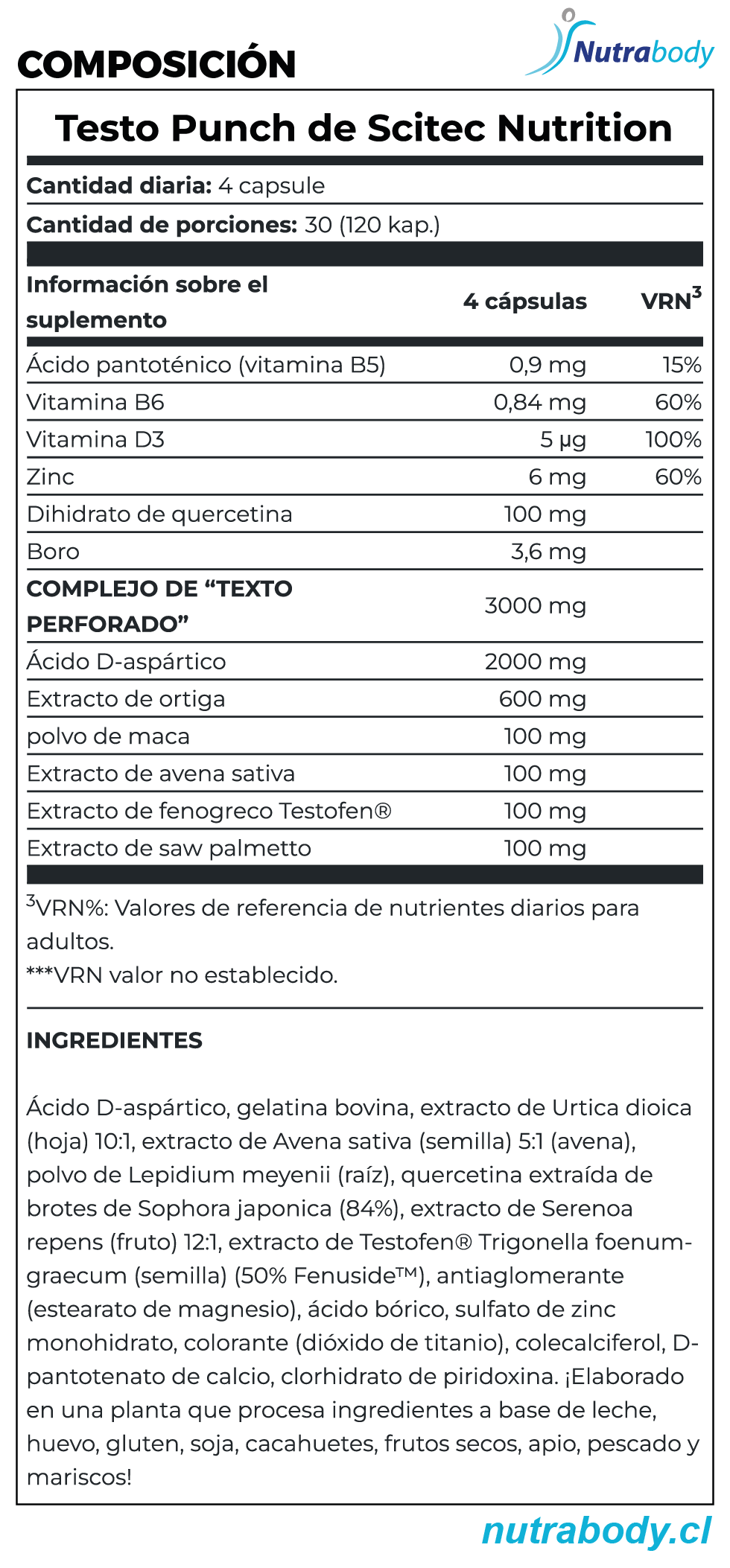 Testo Punch es un suplemento nutricional formulado con extractos vegetales y aminoácidos, como ácido aspártico, fenogreco, avena sativa, maca y serenoa, orientado a complementar planes de entrenamiento y bienestar masculino.