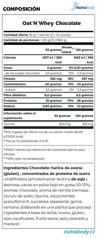 La avena es una fuente nutritiva con muchos adeptos, tengan o no una gran actividad física. Por comodidad, en este producto ya se han combinado avena y proteína de suero de gran calidad para constituir una comida que se puede consumir en cualquier momento del día como apoyo a las actividades diarias. La proteína añadida proviene exclusivamente del suero. Las proteínas dietéticas son la fuente de nitrógeno y aminoácidos indispensables que el cuerpo necesita para el aumento y la conservación del tejido. Por lo tanto, la proteína de Oat' n' Whey contribuye a que aumente y a conservar la masa muscular*.