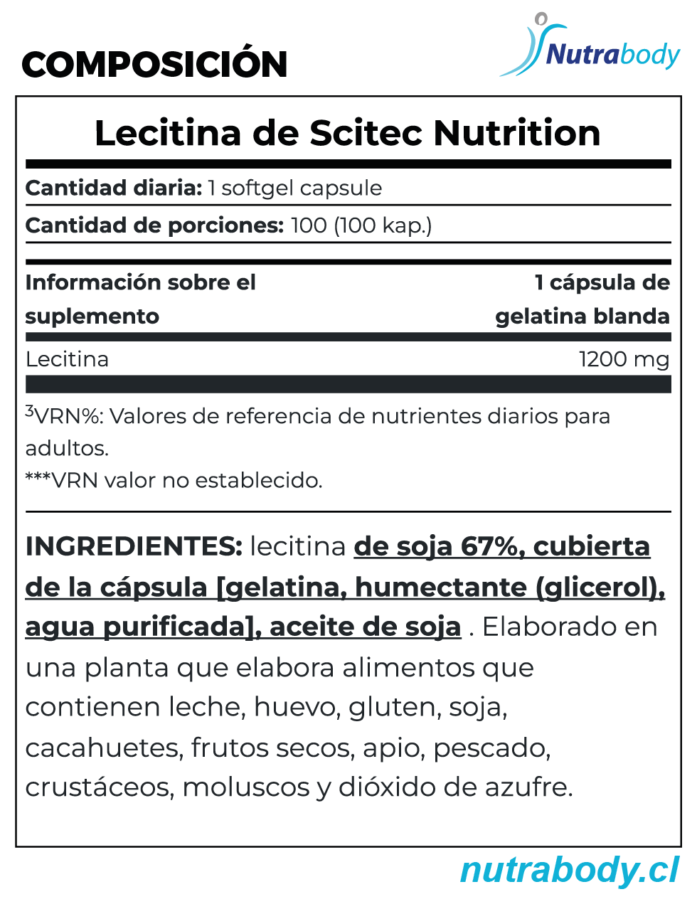INGREDIENTS: soy lecithin 67%, capsule shell [gelatin, humectant (glycerol), purified water], soybean oil. Made in a plant that manufactures milk, egg, gluten, soy, peanuts, nuts, celery, fish, crustacean, molluscs and sulphur dioxide containing foods.
