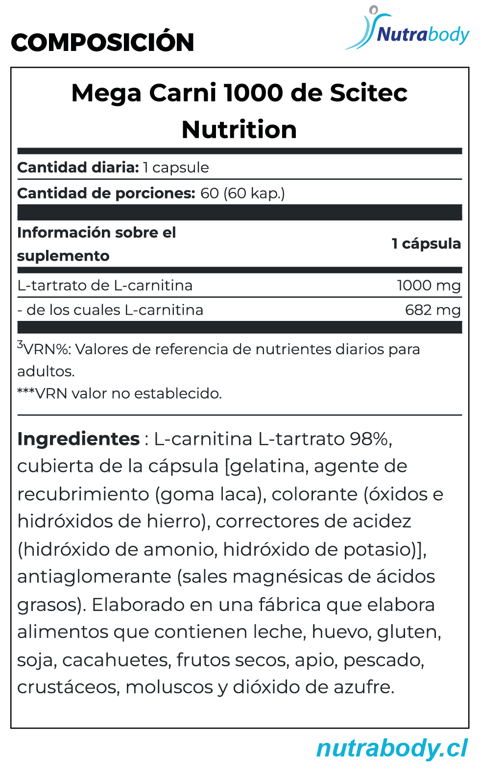 Mega Carni de Scitec Nutrition es un suplemento en cápsulas que entrega 1.000 mg de L-Carnitina por porción, diseñado para quienes buscan apoyar planes de control de peso, definición corporal y rendimiento físico dentro de un estilo de vida activo.