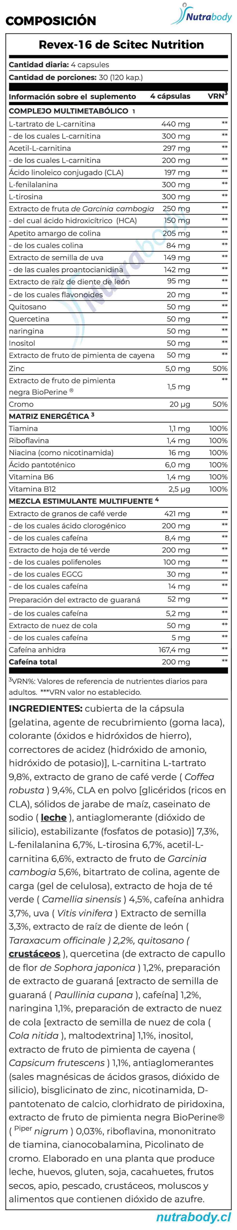 Revex HC es un suplemento termogénico multicomponente, formulado con ingredientes como cafeína de distintas fuentes, L-carnitina, CLA, extractos vegetales y vitaminas del complejo B, diseñado para integrarse en programas de entrenamiento y control de peso.