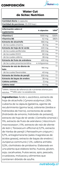 Water Cut es un fórmula compleja tanto para gente cotidiana como para deportistas profesionales que mejora la eliminación del exceso de agua. La fórmula contiene una cuidada selección de 8 micronutrientes y extractos herbales con efectos sinérgicos. Se ha diseñado Water Cut sin cafeína ni otros estimulantes para una máxima versatilidad.